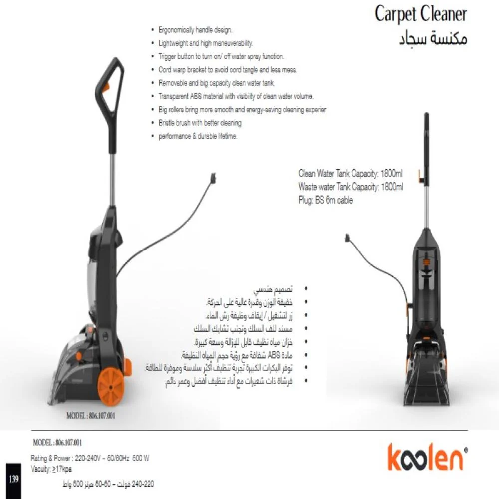 الخلاصة: مكنسة كولين لتنظيف السجاد مثالية لمن يبحث عن أداء تنظيف قوي وفعال مع مرونة في التعامل مع مختلف أنواع الأرضيات. مزودة بخزانات مياه مزدوجة وقدرة على التحكم في رش الماء، توفر لك تجربة تنظيف مريحة وعملية تجعلها أداة أساسية لأي منزل.